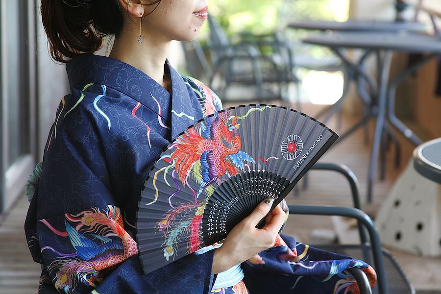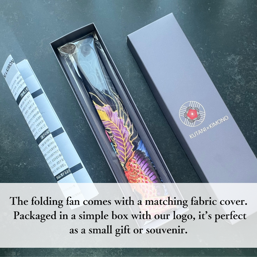 3.KUTANI*KIMONOロゴが入ったシンプルな箱入りなので、自分用としてはもちろん日頃の感謝を込めたギフトや手土産としてもお選びいただけます。扇子は同柄の収納袋入りで携帯に便利!(収納袋の文様は裁断箇所により一つ一つ異なります)