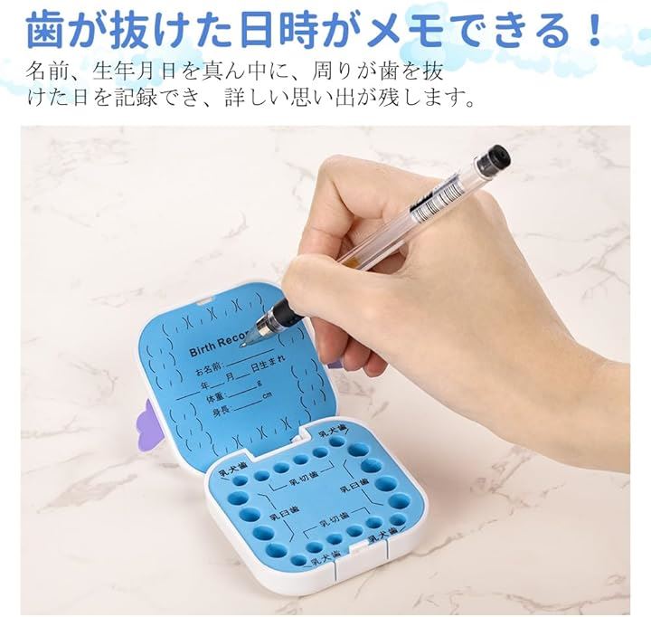 「ペンで記録に残る」:乳歯が抜けた日付をボールペンで記入できるものは、思い出をより詳細に保存できる乳歯入れケース。