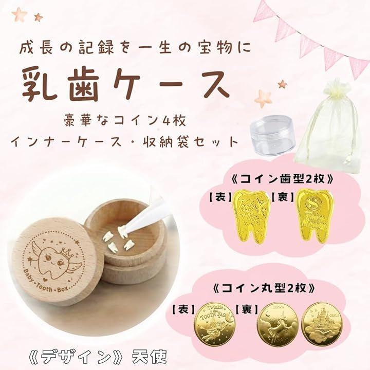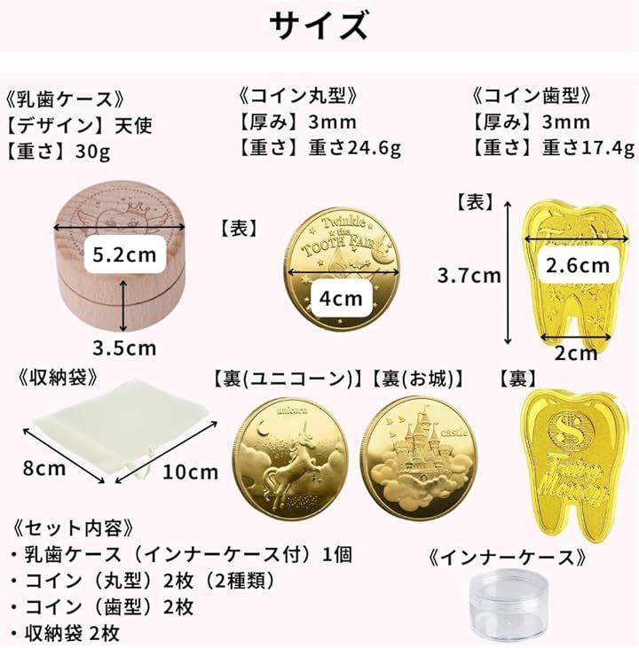 「サイズ」乳歯ケース:5.2x3.5cm・コイン(丸型):直径4cm・コイン(歯型):2.6x3.7cm・収納袋:8x10cm(詳しくは画像にてご確認下さい)「セット内容」乳歯ケース(インナーケース付)1個・コイン(丸型)2枚(2種類)・コイン(歯型)2枚・収納袋 2枚「デザイン」妖精 / 天使 *ケースは天然木の為、木目の出方・イラストの位置などが1点1点異なります。