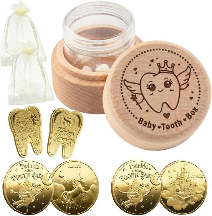 「成長の記念を魔法の思い出に」 お子様の初めて抜けた歯を大切に保管できる木製乳歯ケースと、欧米の習わしで人気の「歯の妖精」から届くトゥースフェアリーコイン4枚、収納用オーガンジー巾着2枚の豪華フルセットです。