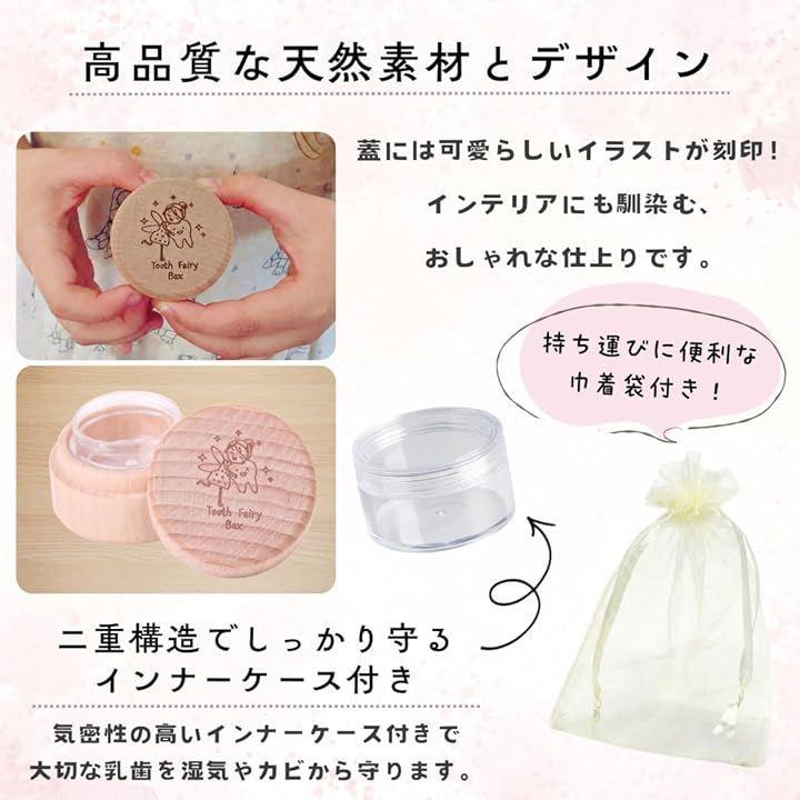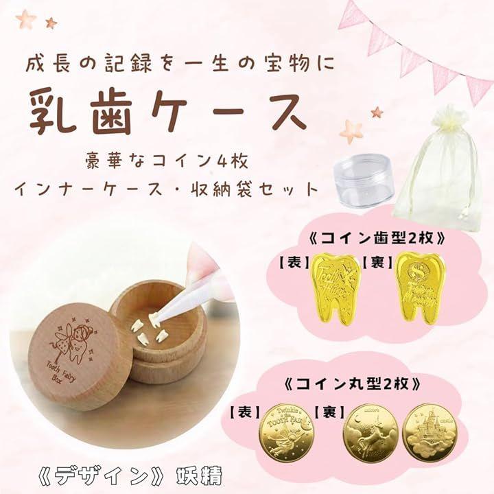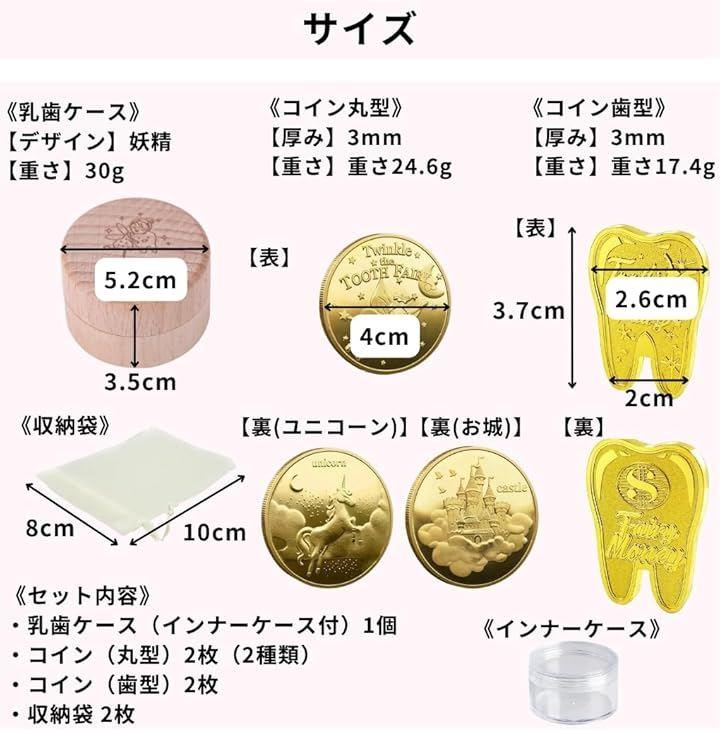 「サイズ」乳歯ケース:5.2x3.5cm・コイン(丸型):直径4cm・コイン(歯型):2.6x3.7cm・収納袋:8x10cm(詳しくは画像にてご確認下さい)「セット内容」乳歯ケース(インナーケース付)1個・コイン(丸型)2枚(2種類)・コイン(歯型)2枚・収納袋 2枚「デザイン」妖精 / 天使 *ケースは天然木の為、木目の出方・イラストの位置などが1点1点異なります。
