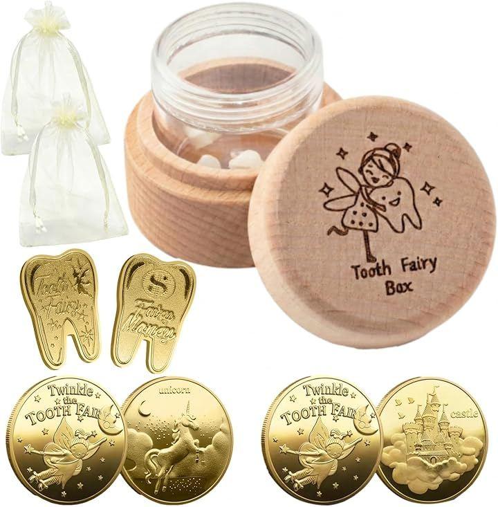 「成長の記念を魔法の思い出に」 お子様の初めて抜けた歯を大切に保管できる木製乳歯ケースと、欧米の習わしで人気の「歯の妖精」から届くトゥースフェアリーコイン4枚、収納用オーガンジー巾着2枚の豪華フルセットです。
