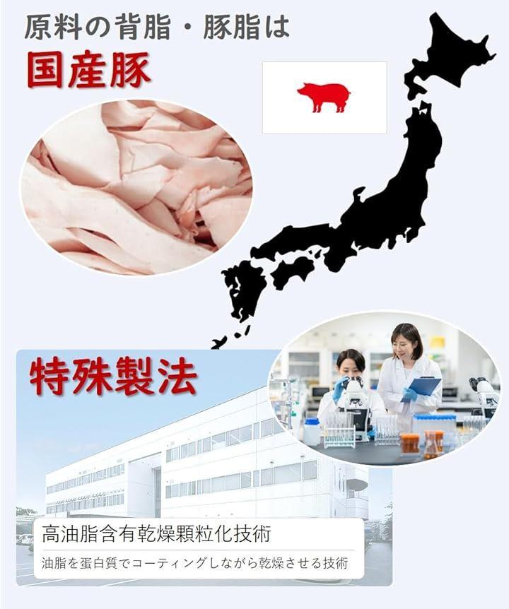 「高油脂含有乾燥顆粒化技術」という、油脂をタンパク質でコーティングしながら乾燥させる特殊な技術で製造。