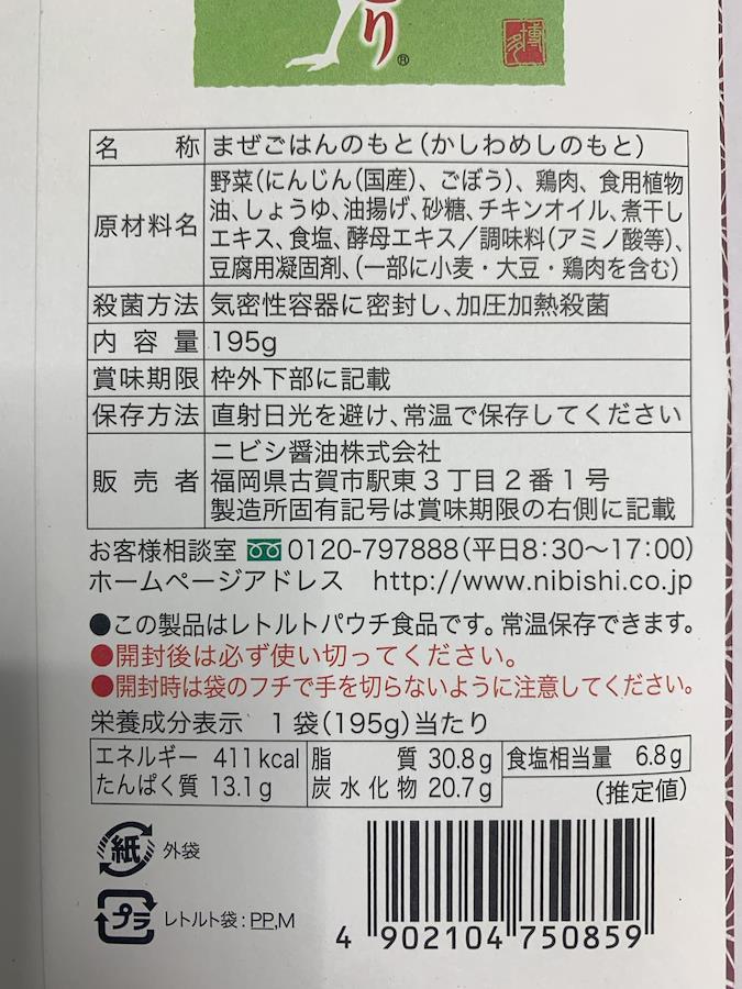 内容量:195g原材料:野菜(にんじん、ごぼう)、鶏肉、食用植物脂、しょうゆ、油揚げ、砂糖、チキンオイル、煮干しエキス、食塩、酵母エキス、調味料(アミノ酸等)、豆腐用凝固剤、(原材料の一部に小麦、大豆を含む)商品サイズ(高さ×奥行×幅):230mm×154mm×10mmブラント名: 二ビシメーカー名: 二ビシ醤油【重要】メーカーによる商品リニューアルに伴いパッケージ(内容量も含む)変更が行われた場合、新パッケージでお届け致します事ご了承願います。