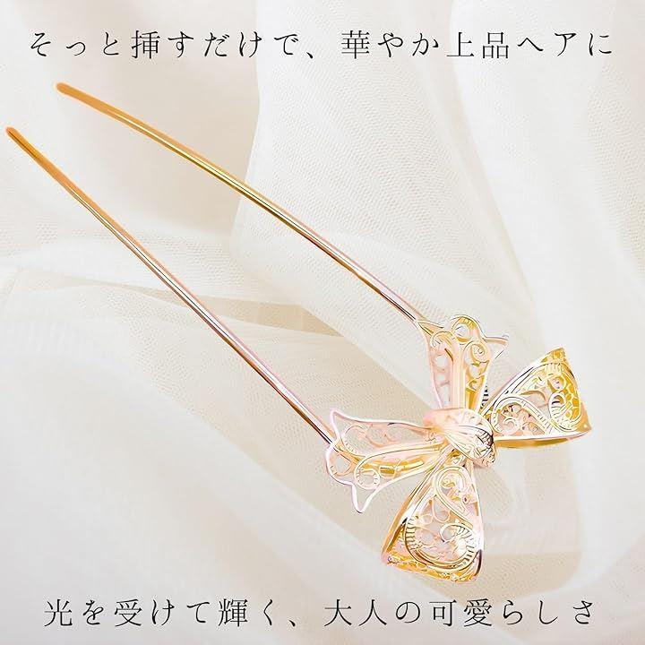 「透かし模様のリボンデザイン簪」繊細な透かし模様を施したリボンモチーフが目を引く、上品な二本挿しの簪です。