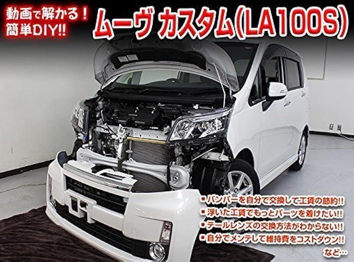 ムーヴ カスタム LA100S DVD収録内容 : 「外装編」 1.フロントバンパー脱着方法 2.リアバンパー脱着方法 3.ヘッドライトユニット脱着方法 4.テールライトユニット脱着方法 5.ヘッドライトランプ(ハイ)脱着方法 6.フロントポジションランプ脱着方法 7.フロントウィンカーランプ脱着方法 8.フロントフォグランプ脱着方法 9.リアランプ類脱着方法 10.ハイマウントストップランプ脱着方法 11.ライセンスランプ脱着方法 12.サイドミラー脱着方法 13.ホーン脱着方法 14.ワイパー(ゴム・ブレード)脱着方法 15.エアクリフィルター脱着方法 16.ヒューズ脱着方法 17.バッテリーマイナス端子絶縁方法 18.バッテリー脱着方法