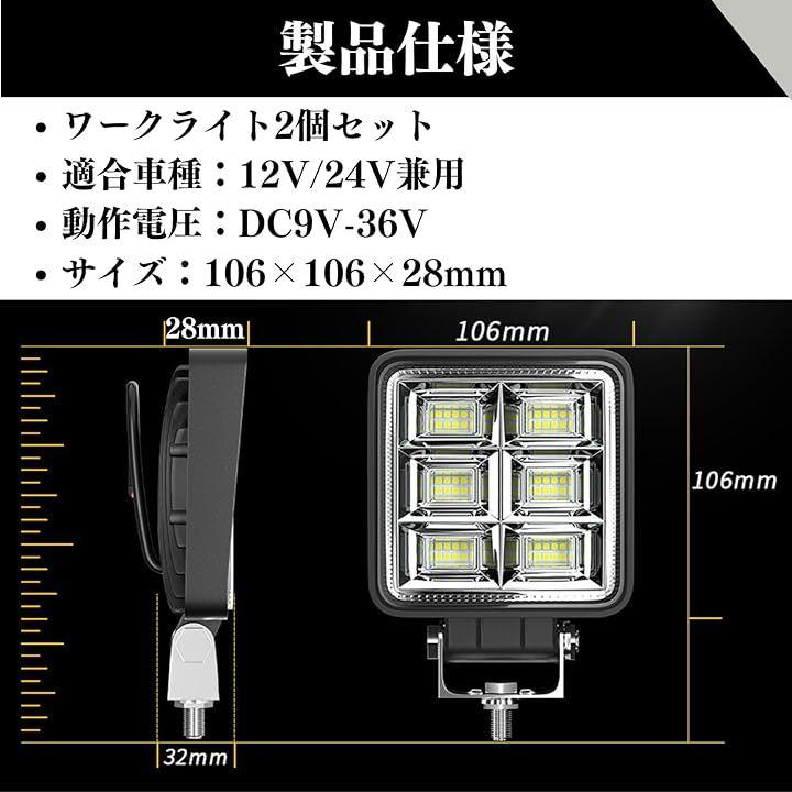 互換品ワークライト 144w 12v-24v 3000 ルーメン 2個 爆光 ステー付き スポットライト 作業灯 路肩灯 補助灯 投光器 デイライト 角度調整 ダンプ トラック