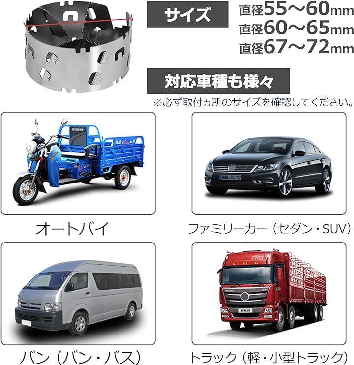 「寸法」直径55~60mm、直径60~65mm、直径67~72mm「機能」呼気率アップ、燃費向上、燃費アップ「素材」ステンレス「備考」組み立て式*サイズをご確認の上お求めください。