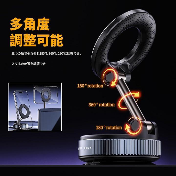 マグネット部は300°、アームは240°回転可能で、スマホの角度と高さを自由に調整。