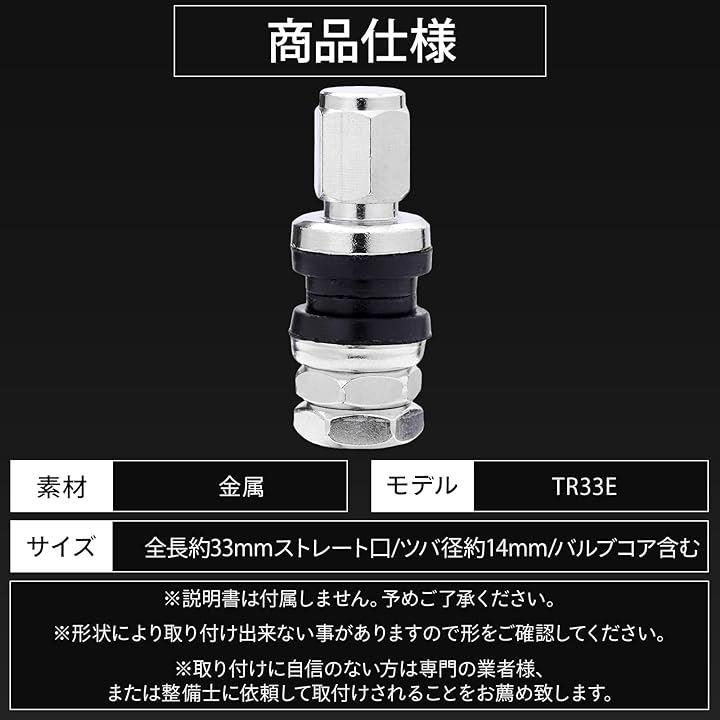 「仕様」モデル:TR33E / サイズ(約):全長33mm、ストレート口 、ツバ径約14mm 、バルブコア含む / タイプ:クランプイン・チューブレスバルブ / 素材:金属製 / カラー:クロームメッキ / 最大PSI:120PSI / バリエーション:4個セット、8個セット、10個セット