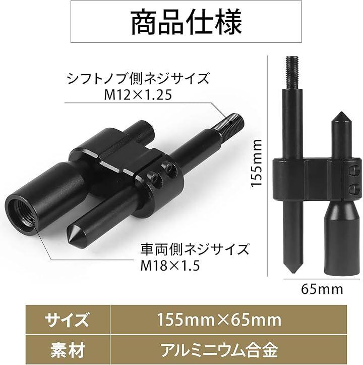 「汎用性」シフトノブ側の取付けねじサイズはM12x1.25、車両側の取付けねじサイズはM18x1.5で、8mm、10mm、12mmの3種類の変換アダプターが付属。