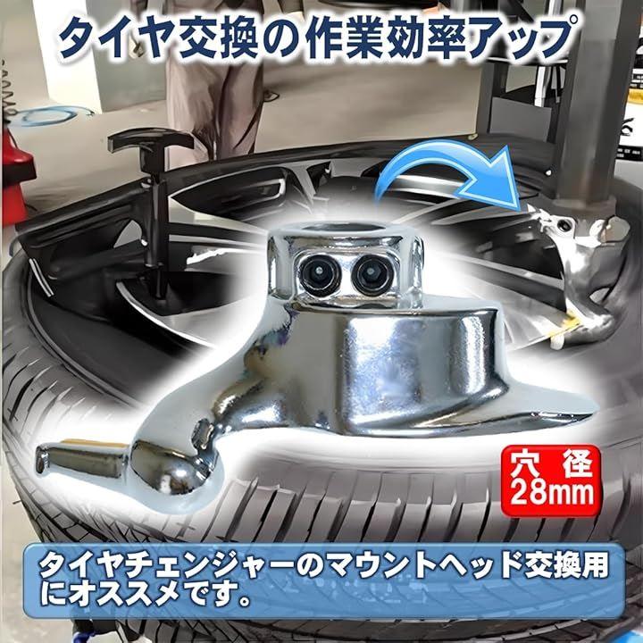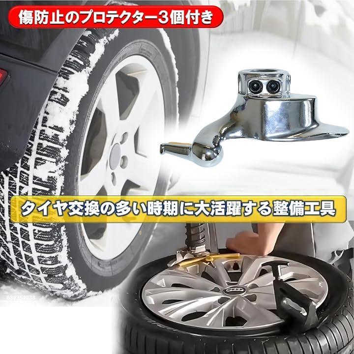 タイヤチェンジャーは、直径28ミリの汎用タイプ、ホイールのキズ防止プロテクター付き。