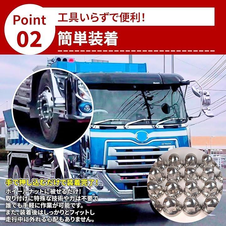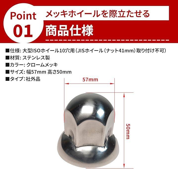 商品仕様 : ・対応規格: 大型ISOホイール10穴用(*JISホイール(ナット41mm)には取り付け不可)・材質: ステンレス製・カラー: クロームメッキ・サイズ: 幅57mm x 高さ50mm