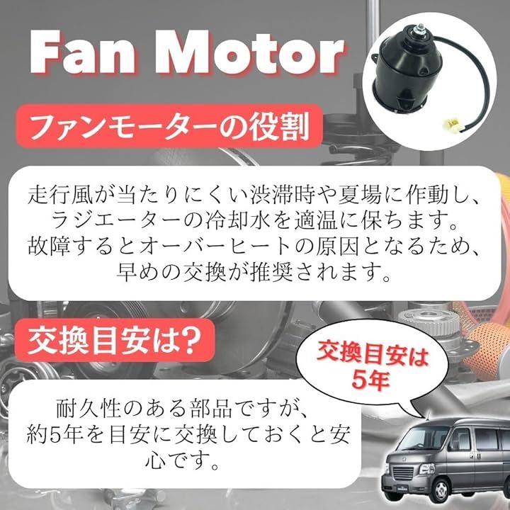 「商品概要」ホンダ バモス・バモスホビオ(HM1/HM2/HM3/HM4/HJ1/HJ2)などに適合する電動ファンモーター社外品です。
