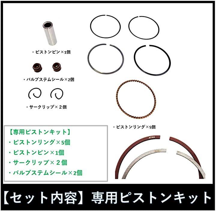 ・「専用ピストンキット」 (ピストンリングx5個、サークリップx2個、ピストンピンx1個 、バルブステムシールx2個) ・「ガスケット1Set」 ・シリンダーベースガスケット ・シリンダーヘッドガスケット 合計2点