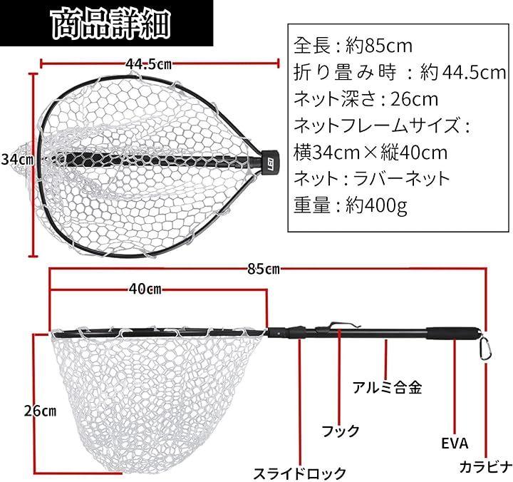「仕様・サイズ」全長 : 約85cm / 折り畳み時 : 約44.5cm / ネット深さ : 26cm / ネットフレームサイズ : 34cmx40cm / ネット : ラバーネット / 重量 : 約400g