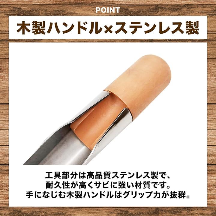 「木製ハンドルxステンレス製」工具部分は高品質ステンレス製で、耐久性が高くサビに強い材質です。