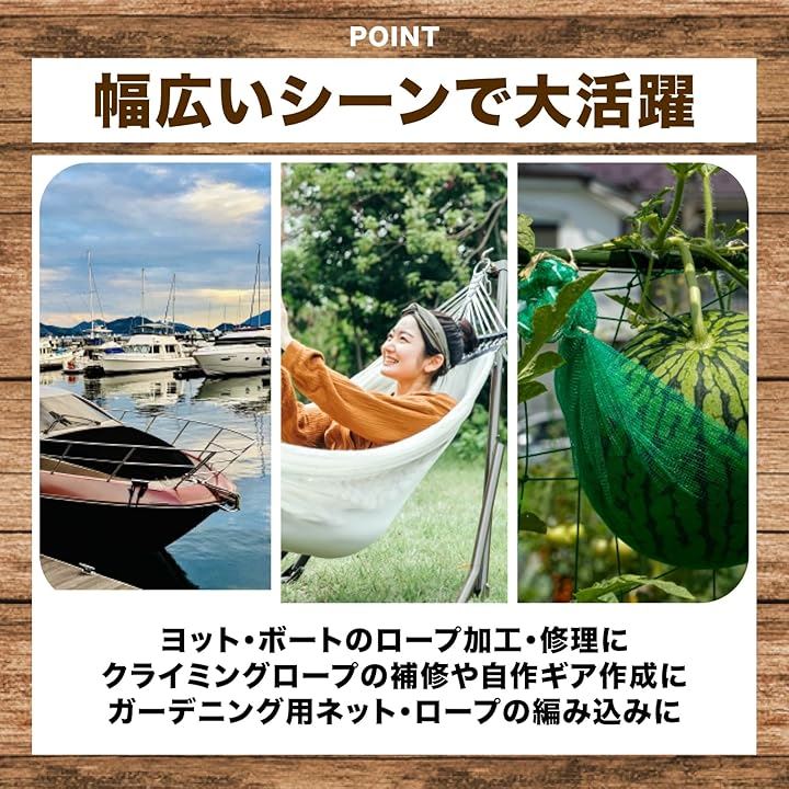 「幅広いシーンで大活躍」ヨット・ボートのロープ加工・修理に/クライミングロープの補修や自作ギア作成に/ガーデニング用ネット・ロープの編み込みに/ペット用リードやハンモック製作に/手芸やDIYクラフトなどに