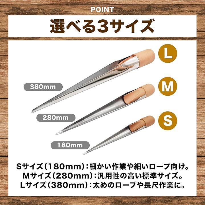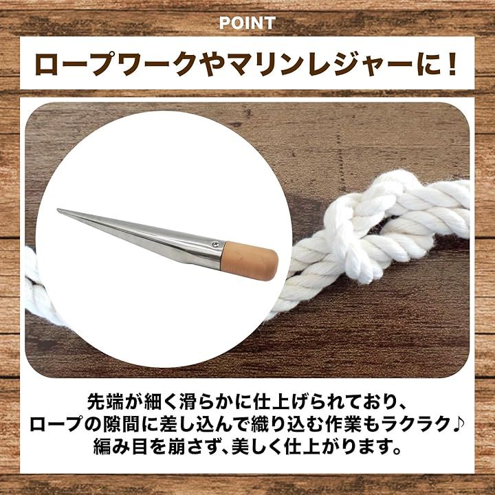 先端が細く滑らかに仕上げられており、ロープの隙間に差し込んで織り込む作業もラクラク。