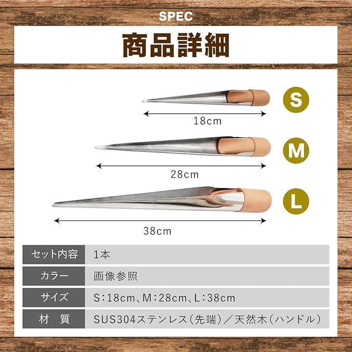 「商品詳細」セット内容:1本 カラー:画像参照 サイズ:S:180mm、M:280mm、L:380mm 材質:SUS304ステンレス(先端)/天然木(ハンドル)