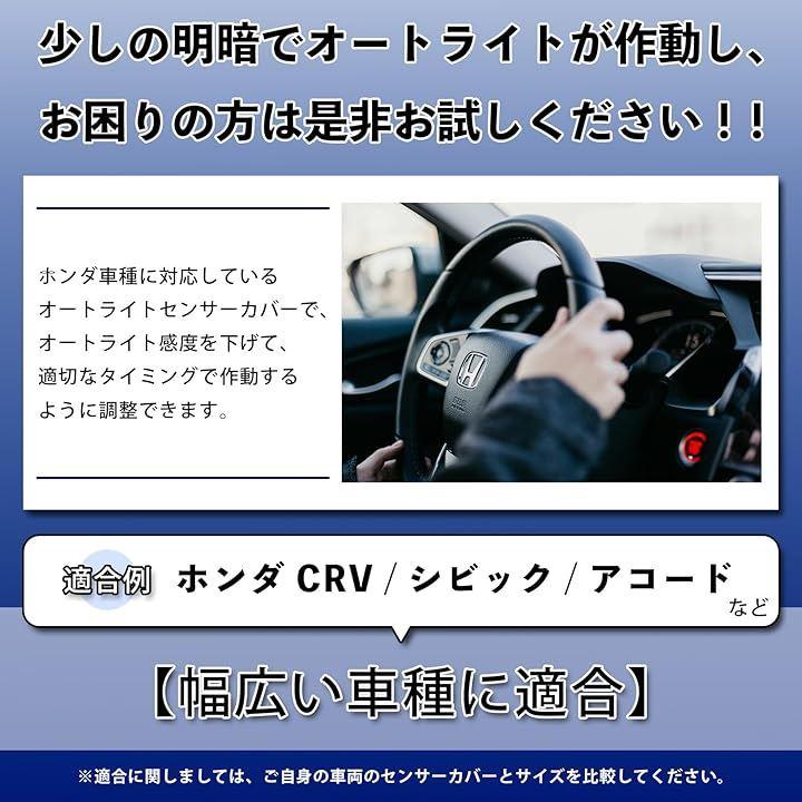「少しの明暗でオートライトが作動してお困りの方は是非。。」ホンダ車種に対応しているオートライトセンサーカバーで、オートライト感度を下げて、適切なタイミングで作動するように調整できます。