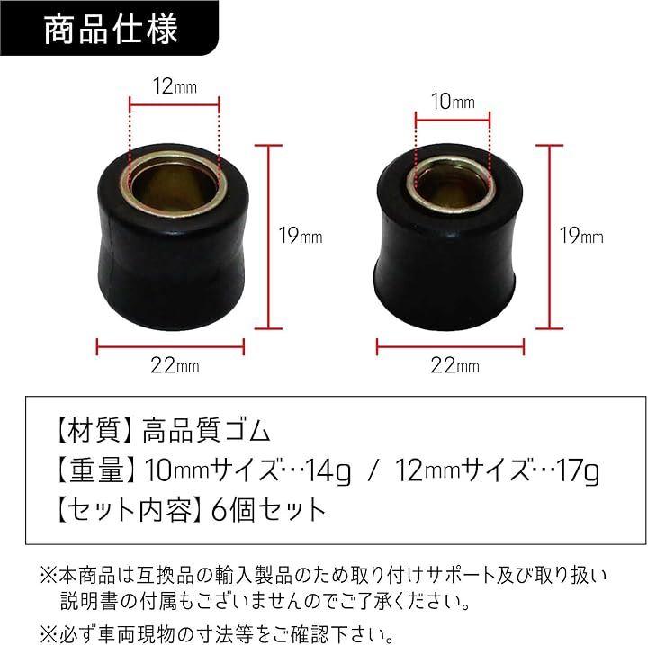 「商品仕様」2サイズ6個セット「10mmサイズ」内径:10mm、外径:22mm、高さ:19mm「材質」高品質ゴム「重量」14g