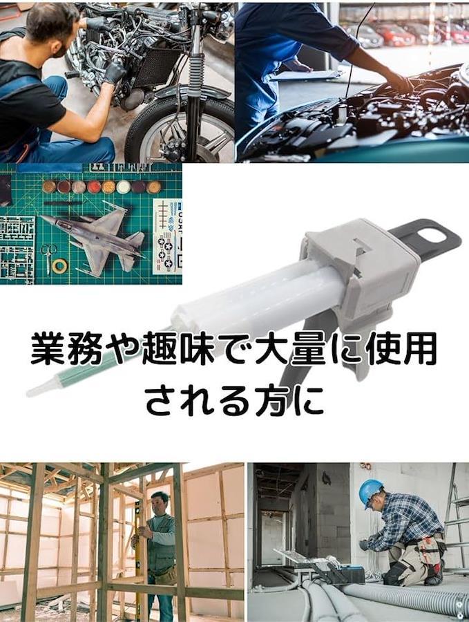 メグミックス、デブコン、メタルグリップ、Grasp、グラスプ、ロックタイト、ウレタンVOICE、3M、セメダイン、メグロ化学など、様々な2液硬化型エポキシ、ウレタン接着剤に使用することができます。