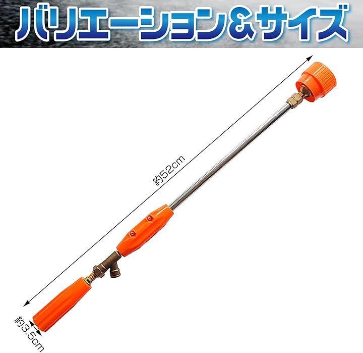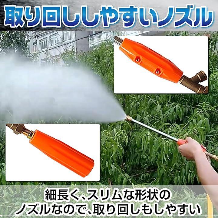 噴霧器は、手持ちの洗浄機や動力噴射器、ホースに取り付けるだけ。後方のレバーで拡噴、直噴の調節可能。