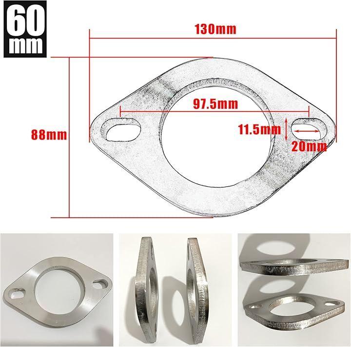 「51Φサイズ」 ボルト穴:11.5mmx20mm / ボルト穴ピッチ:87.5mm / 厚さ:9.7mm 「60Φサイズ」 ボルト穴:11.5mmx20mm / ボルト穴ピッチ:97.5mm / 厚さ:9.7mm 「70Φサイズ」 ボルト穴:12mmx20mm / ボルト穴ピッチ:109mm / 厚さ:9.7mm 「76Φサイズ」 ボルト穴:12.5mmx17.5mm / ボルト穴ピッチ:101mm / 厚さ:9.7mm 「81Φサイズ」 ボルト穴:10mmx12mm / ボルト穴ピッチ:107mm / 厚さ:9.7mm サイズによって適合するマフラーや取り付け方法が異なりますので、現車の仕様に合わせてご選択ください。