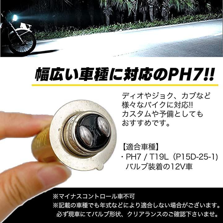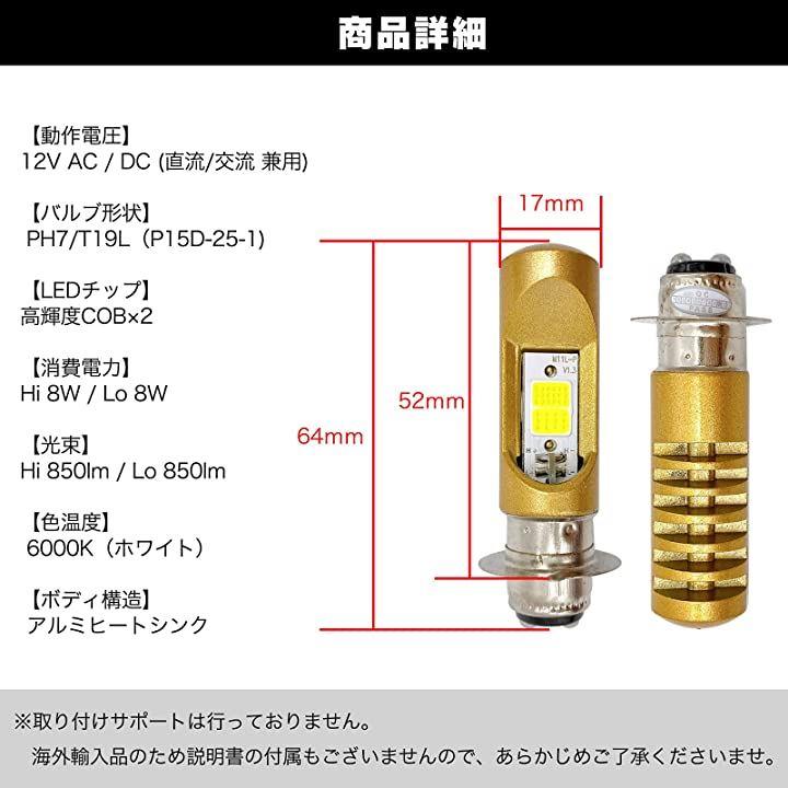 ・「仕様」 *電圧:12V AC / DC (直流/交流) *バルブ形状: PH7 / T19L(P15D-25-1) *LEDチップ:高輝度COBチップx2 *消費電力:Hi 8W / Lo 8W *光束:Hi 850lm / Lo 850lm *色温度: 6000K(ホワイト) *ボディ構造:アルミヒートシンク *サイズ : 64mmx17mm