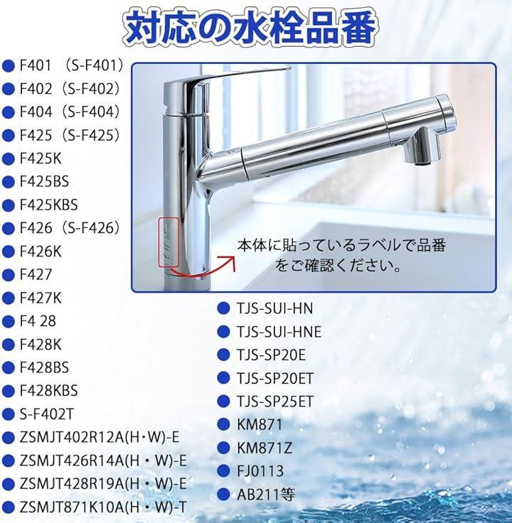 「適合水栓の型番」F401 (S-F401)、F402(S-F402)、F404(S-F404)、F425(S-F425)、F425K、F425BS、 F425KBS、F426(S-F426)、F426K、F427、F427K、F4 28、F428K、F428BS、F428KBS、 S-F402T、ZSMJT402R12A(H・W)-E、ZSMJT426R14A(H・W)-E、ZSMJT428R19A(H・W)-E、 ZSMJT871K10A(H・W)-T、TJS-SUI-HN、TJS-SUI-HNE、TJS-SP20E、TJS-SP20ET、TJS-SP25ET、 KM871、KM871Z、FJ0113、AB211等。