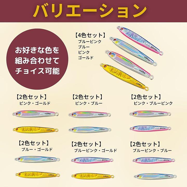 メタルジグとして、比重の高い鉛素材を使用したジグは、初心者からプロのアングラーまで広く愛用されています 特に100gのメタルジグは、ジギングで大物を狙う際に最適です 4種類のカラー(ピンク、ブルーピンク、ゴールド、ブルー)は、光の条件や釣り場に応じて使い分けが可能で、さまざまなターゲットフィッシュに対応します