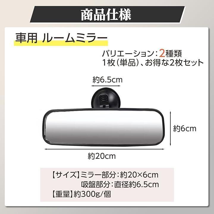 「サイズ」ミラー部分:約20x6cm、吸盤部分:直径約6.5cm、「重量」約300g/個、「バリエーション」1枚(単品)とお得な2枚セットの2種類