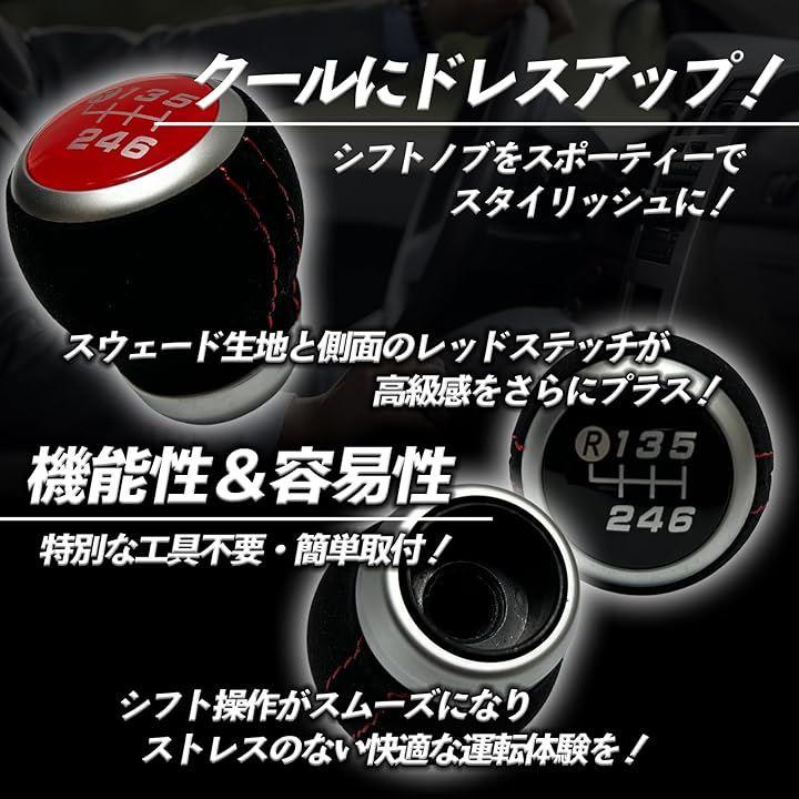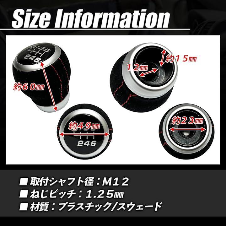「商品詳細」 内容物: シフトノブ本体x1 サイズ: 縦約60mm、直径約50mm 材質: PP / スウェードタイプレザー 取り付けシャフト径:M12 ねじピッチ:1.25mm