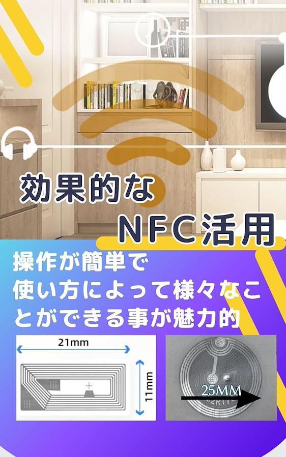 NFCシールのセットは、13.56MHZの周波数を利用し、144バイトですので近くにあるNFC対応機器とのワイヤレス通信を可能としており近距離と短いものの、対応機器同士を軽く触れるほど近づけるだけで簡単に通信を行うことが可能です。
