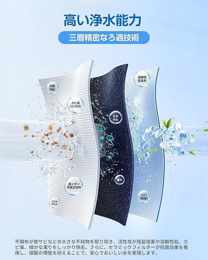 「5物質除去」水道水に含まれる残留塩素、濁り、CAT(農薬)、鉛、2-MIB(カビ臭)合計5項目の有害物質をしっかり除去。