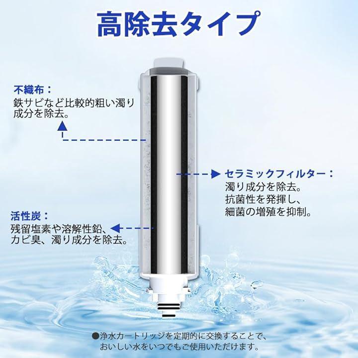 「15+3物質、高塩素除去」遊離残留塩素(カルキ)、PFOS・PFOA、濁り、クロロホルム、ブロモジクロロメタン、ジブロモクロロメタン、総トリハロメタン、溶解性鉛、2-MIB(カビ臭)、CAT(農薬)、1,2-DCE、ブロモホルム、テトラクロロエチレン、トリクロロエチレン、ベンゼン、ジェオスミン、フェノール類、鉄(微粒子状)、アルミニウム(中性)などの物質を除去、水道水を綺麗で美味しい水に変えます。