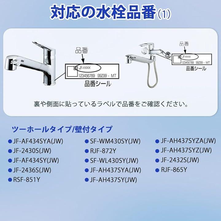 「適合水栓の型番・ツーホールタイプ/壁付タイプ」JF-AF434SYA(JW)、JF-2430S(JW)、JF-AF434SY(JW)、JF-2436S(JW)、RSF-851Y、SF-WM430SY(JW)、RJF-872Y、SF-WL430SY(JW)、JF-AH437SYA(JW)、JF-AH437SY(JW)、JF-2432S(JW)、RJF-865Y。