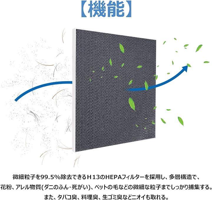 「性能」微細粒子を99.5%除去できるH13のHEPAフィルターを採用し、多層構造で、花粉、アレル物質(ダニのふん・死がい)、ペットの毛などの微細な粒子までしっかり捕集する。