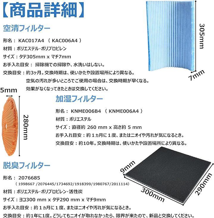 「形名」 集塵フィルター KAC017A4 ( KAC006A4 )/ 加湿フィルター KNME006B4 ( KNME006A4 ) / 脱臭フィルター 2076685 ( 1998667 /2076445/1734692/1918399/1980767/2011114) 。