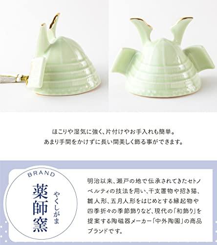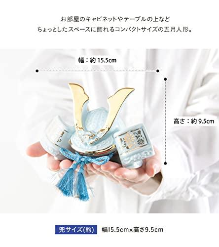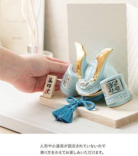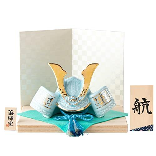 ??【コンパクトで春らしい淡いカラーの兜かざり】気軽に飾っていただける陶器製の兜です。春めいた淡いカラーリングの水色と屏風の白が清涼感があります。また陶器なのでほこりや湿気に強く、片付けやお手入れもカンタン。あまり手間をかけずに長い間美しく飾ることができます。オリジナルのミントグリーンの敷物をおつけしています。また書道師範の手書きによるお名前木札のサービスもついています。 ??【木札にお書きするお名前の連絡方法】ご注文時に「ギフト」の設定に?を入れ「ギフトメッセージ」欄に ●お書きするお名前● を入力してください(ページ下方で画像付きで解説)/または「ご注文履歴」よりショップへのメッセージ欄を利用してご連絡くださいませ。お送りいただきました内容を確認後 ご用意いたしますので、お人形とは別に後日ポスト投函でお届けになる場合があります。また内容に不足や漏れがあったり、不明な点がある場合も確認がとれるまでご用意できません。 ??【お届け内容】兜・屏風・台・薬師窯木札 / 名入れ木札(後日別送の場合あり) ??【サイズ(cm)】全体:約 幅19/奥行13.8/高さ17(台+屏風) 兜:約 幅15.5/高さ9.5 ??【素材】陶器ほか ??【加工】日本 ?焼き物の特性上、焼きむら、カスレ、気泡などが生じる場合がございます。また仔細についても個体差がありますが、いずれもメーカーチェックによる合格基準をクリアした商品のみお届けいたしております。