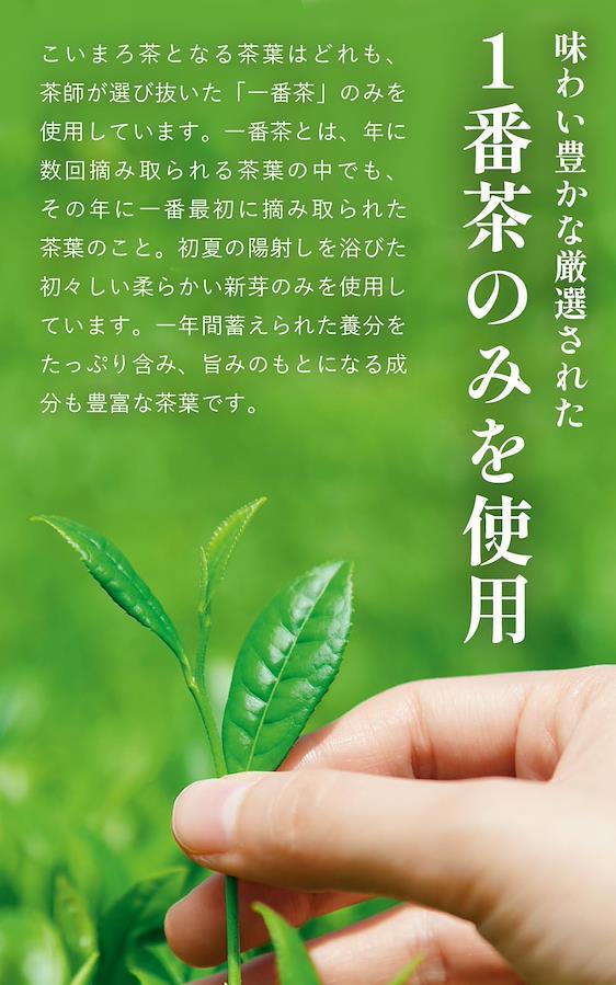 淹れた時の色はきれいな濃い緑色でありながら、味は渋くなくまろやか。これが「こく・まろやか」な日本茶、「こいまろ茶」の特徴です。より美味しく、しかも簡単に日本茶を飲めるように、との思いから、まずお客様に理想の日本茶についてアンケートを実施いたしました。その結果「日本茶の色は濃い緑色」が75%、「日本茶の味は濃くまろやか」が71%という結果が! お客様の求めておられる理想の日本茶は「こく・まろやか」。こうして「こいまろ茶」の開発は始まりました。しかしながら、日本茶の色を濃くすると味は渋くなり、まろやかな味にすると色は薄くなり、試行錯誤を重ねること3年。ようやくお客様の理想の【色は濃く・味がまろやか】な日本茶にたどり着きました。使う茶葉は一番茶葉を100%使用。香り高い若蒸し煎茶、濃厚な味と色の深蒸し煎茶、旨味と奥深いコクが魅力の玉露。個性豊かな3つの味わいを上手に調和させ、それぞれの良さを引き出せるよう高級宇治抹茶を絶妙にブレンド。そうする事で、素材の良さを引き出し上品な口当たりと鮮やかな緑色を実現。まさに「濃いのに渋くなくまろやか」な理想の味です。【免責事項】メーカーによる商品リニューアルに伴いパッケージ(内容量も含む)変更が行われた場合、新パッケージでお届け致します事ご了承願います。