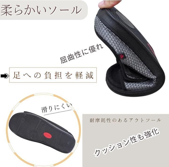 「脱ぎ履きが簡単」面ファスナー付きで甲の部分が大きく開いて、足をスムーズに入れられ、脱ぎ履きも簡単。