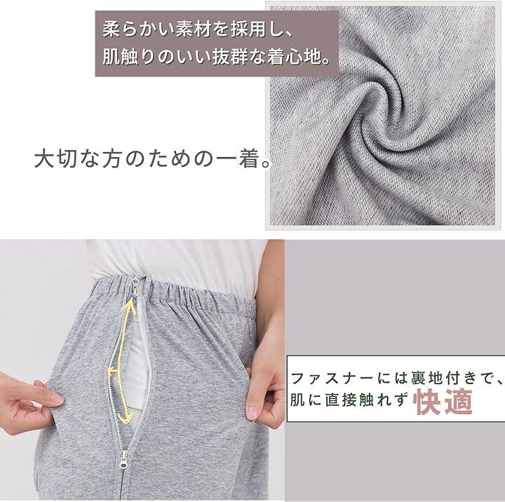 フルオープン仕様、左右のファスナーはウエストから裾まで全開できるため、寝たままでも簡単に着替えができます。