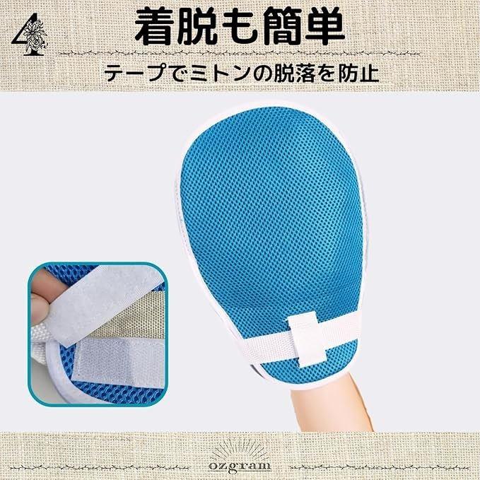 「着脱も簡単」テープでしっかり固定してミトンの脱落を防ぎます