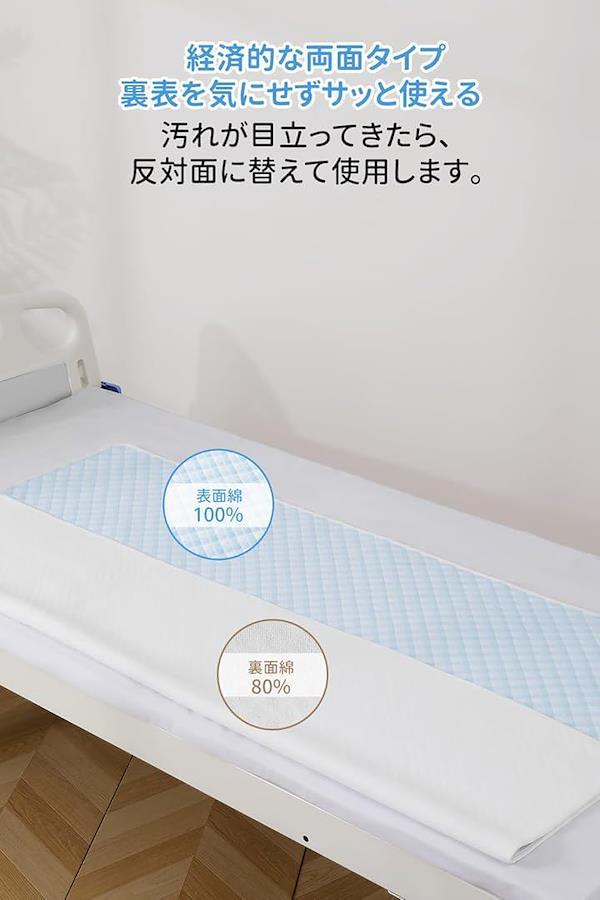 「両面タイプ」両面タイプの防水シーツで、表と裏の両面を使える経済的で便利な介護用品です。