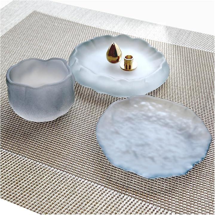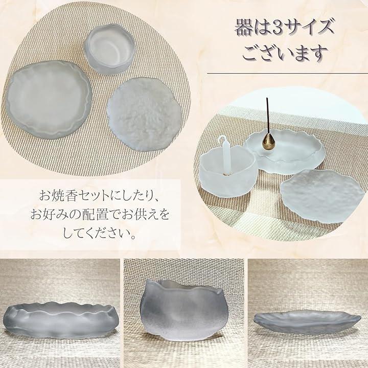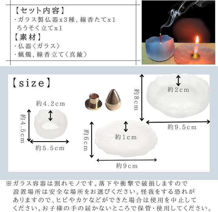 「セット内容」ガラス製仏器x3種、真鍮製 線香たてx1、真鍮製 ろうそく立てx1 合計5点セット 「サイズ」小 幅 約5.5cm 高さ 約4.2cm、中 約6cmx9cm 高さ 約1cm、大 約8cmx9.5cm 高さ 約2cm