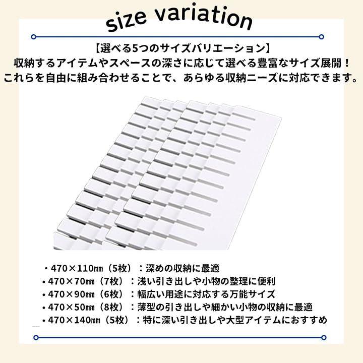 「選べる5つのサイズバリエーション」 収納するアイテムやスペースの深さに応じて選べる豊富なサイズ展開。 470x110mm(5枚):深めの収納に最適 470x70mm(7枚):浅い引き出しや小物の整理に便利 470x90mm(6枚):幅広い用途に対応するサイズ 470x50mm(8枚):薄型の引き出しや細かい小物の収納に最適 470x140mm(5枚):特に深い引き出しや大型アイテムにおすすめ これらを自由に組み合わせることで、あらゆる収納ニーズに対応できます。