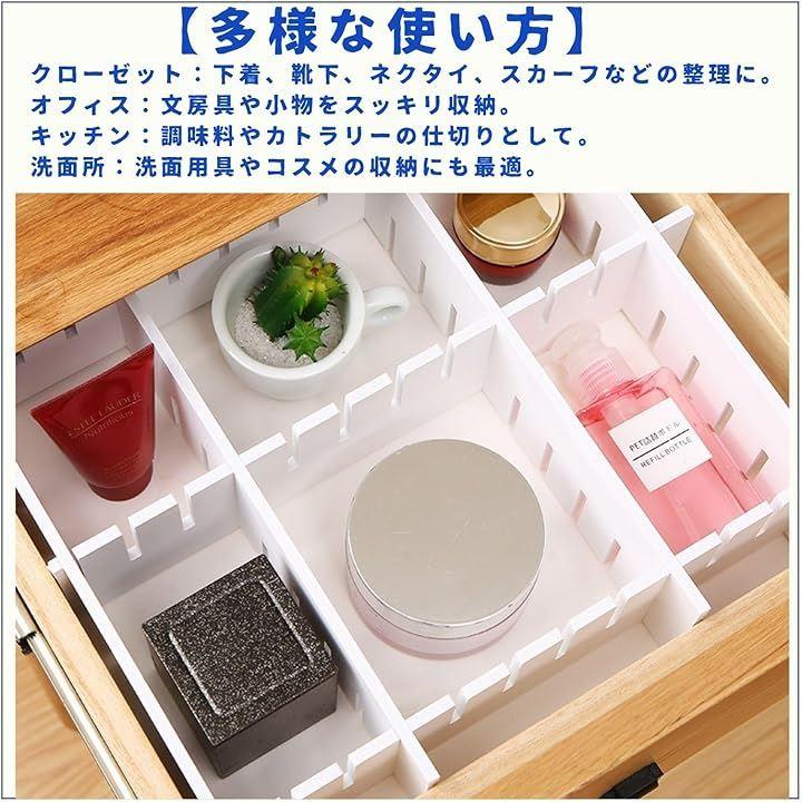「仕切り板セット」多用途対応のカスタマイズ可能な収納ソリューション 「自由なカットでピッタリ設置」 仕切り板は簡単にカットでき、引き出しや収納スペースのサイズに合わせて自由に調整可能。好みのサイズや形状に合わせてカスタマイズすることで、無駄なスペースを一切なくします。