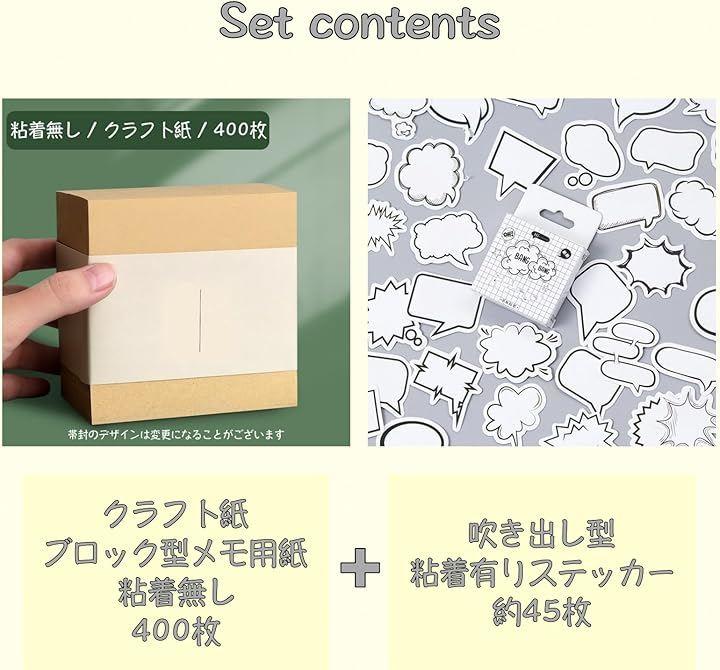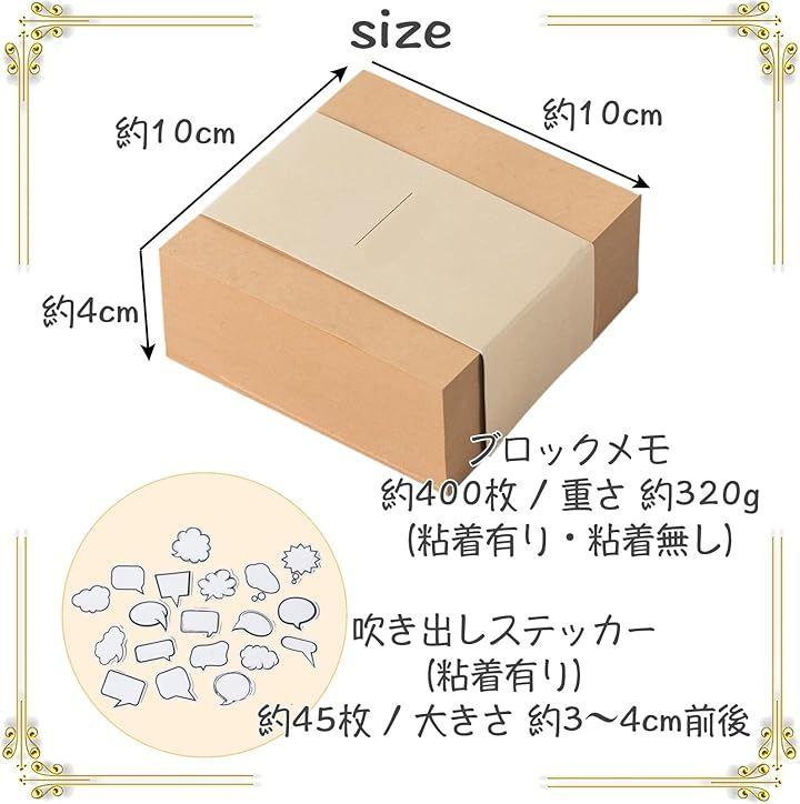 《サイズ》ブロックメモ:10x10x4cm / 吹き出しステッカー:3~4cm(デザインによって異なります)《セット内容》ブロックメモ 1個・吹き出しステッカー 1袋(約45枚)《仕様》粘着有り / 粘着なし